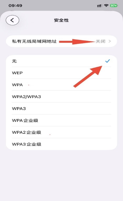 d)选择安全类型为“无”私有无线局域网地址为“关闭”;