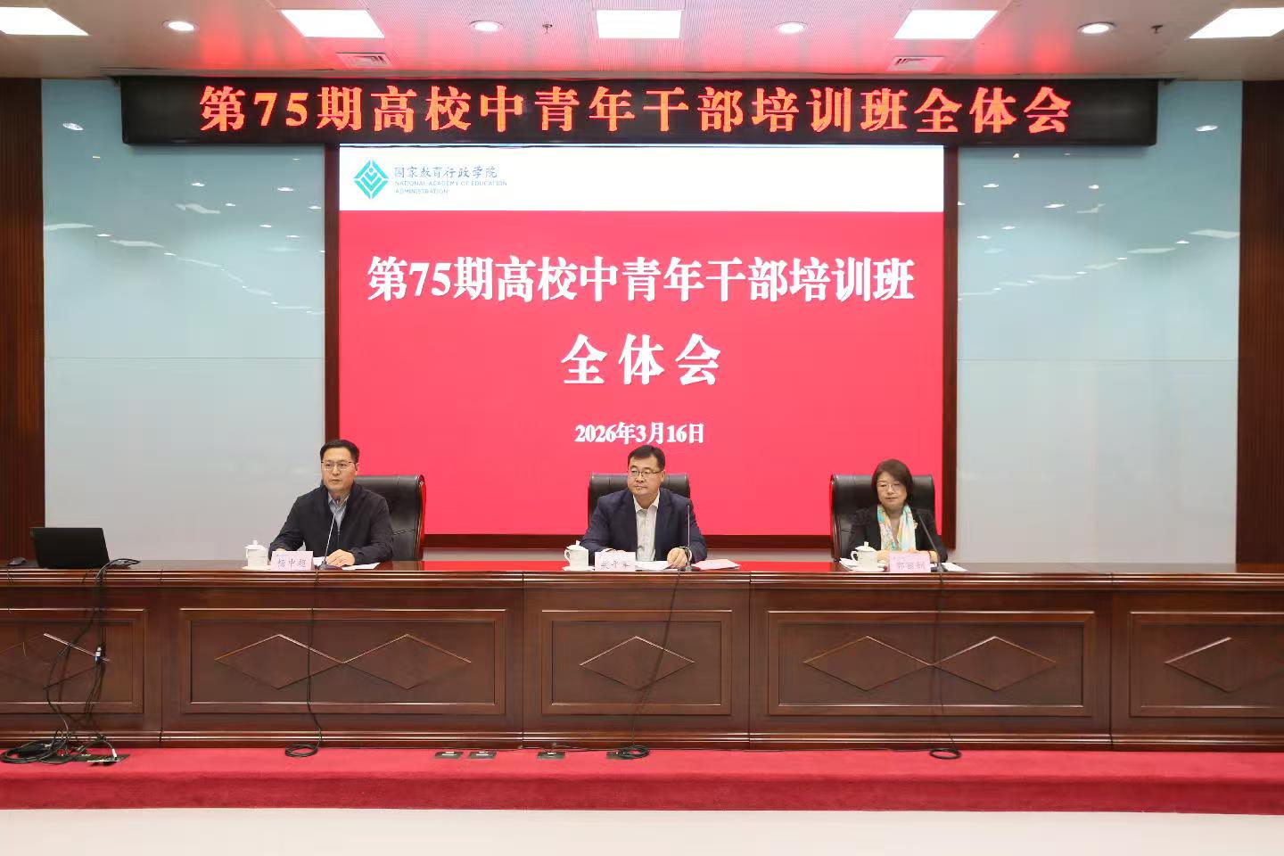 2026年3月16日上午,第75期高校中青年干部培训班召开全体会,国家教育行政学院副院长樊平军出席并致辞。全体会由进修一部副主任杨中超主持。