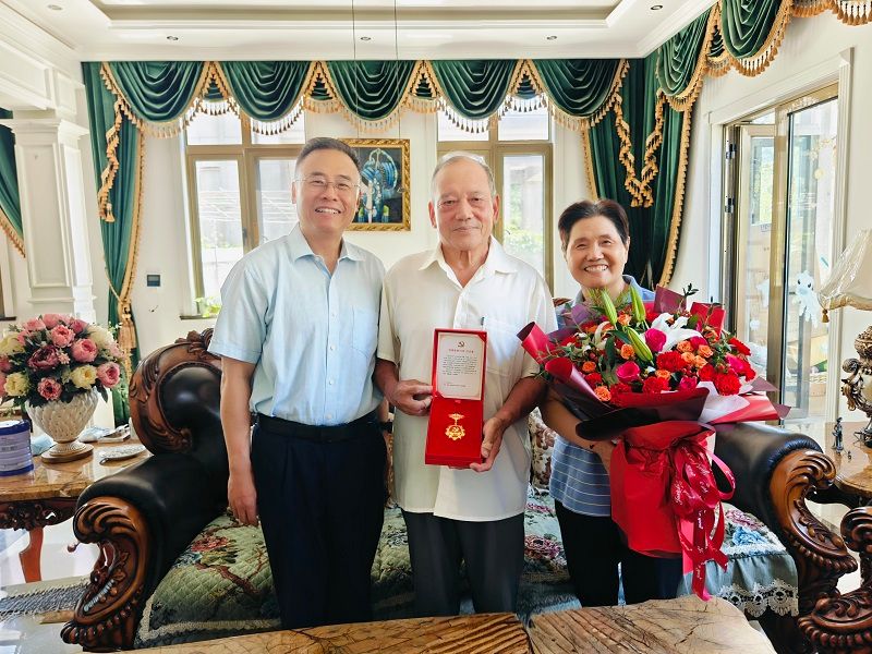为增强老党员的荣誉感、归属感,在建党103周年来临之际,根据中央和国家机关工委有关通知要求,学院相关领导走访党龄50周年的退休党员,为他们颁发“光荣在党50年”纪念章,将党的关怀和温暖传递给老党员。熠熠数十载,灼灼向党心,纪念章闪耀着老党员无悔的忠诚,印证着老党员无言的奉献。 后勤管理服务中心主任李冬同志来到老党员刘志来同志家中,把“光荣在党50年”纪念章颁发给他。刘老师说他从未忘记自己作为一名共产党员的身份,感谢党组织的关心,他会继续发挥老党员的作用,支持学院的各项工作。