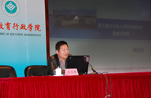中青班学员、浙江海洋大学党委宣传部部长兼新闻中心主任陈宏祖,作“浙江海洋大学人才队伍建设的实践和思考”的主题发言。他通过对在海洋大学所处区位和历史的梳理,针对大学更名工作的历史使命,分析特定地方高校人才队伍建设的目标任务和策略举措,并就大学更名以后及十三五期间的人才队伍建设工作做出了预判。他围绕学校人才队伍建设现状,在加大投入、切实做好人才引进工作;着眼长远、重视中青年骨干教师培养;规范管理、提高人才使用效益统筹发展;协同推进三支队伍建设强化机制、建立人才发展的良好氛围等方面进行了阐述。