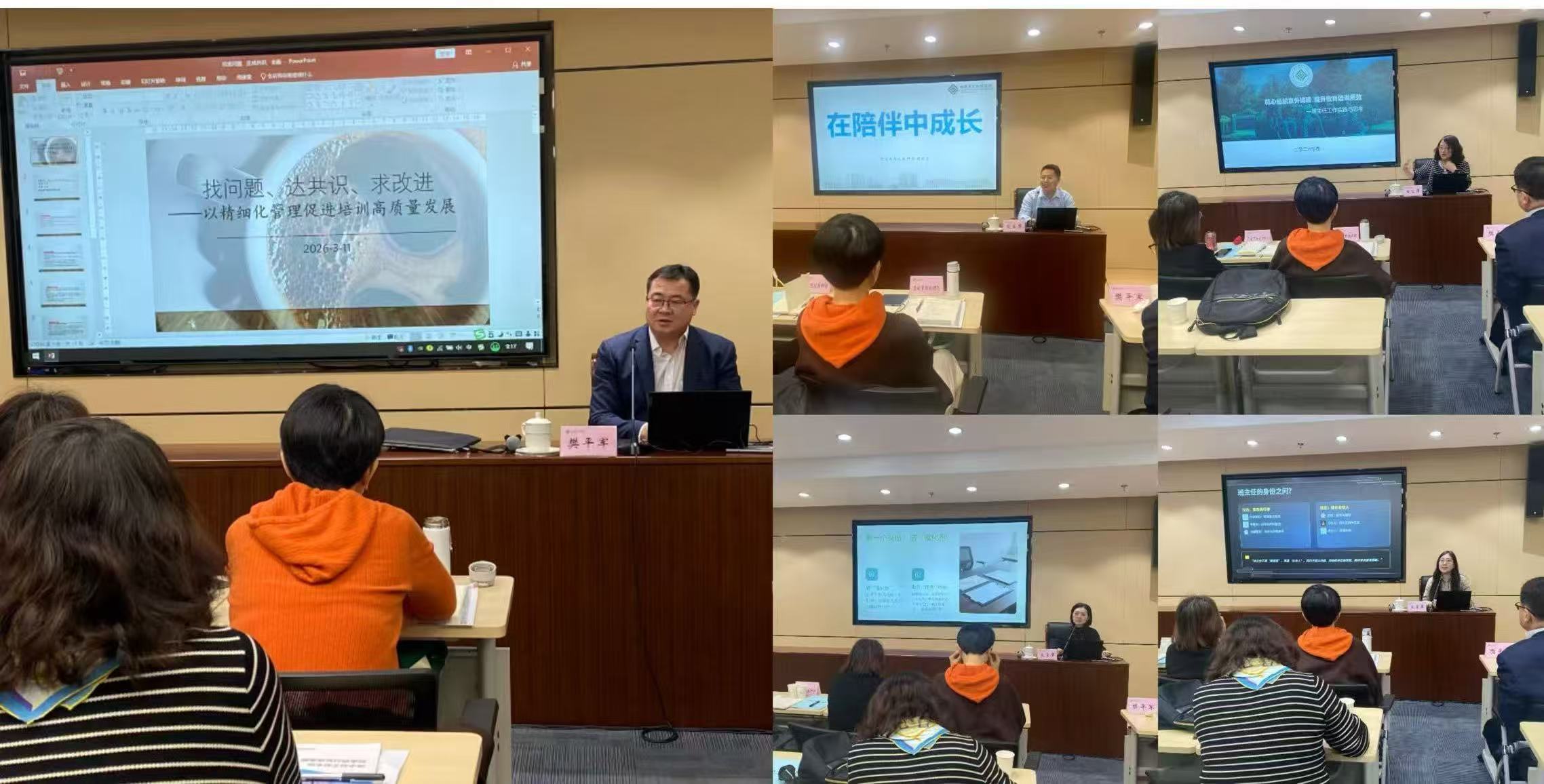 本次内训分两阶段进行。上午以集中学习、经验交流为主。樊平军副院长以“找问题、达共识、求改进——以精细化管理促进培训高质量发展”为题作报告,深入剖析当前培训管理工作中存在的问题、不足和短板弱项,指明优化和改进方向。随后,四位班主任代表分别结合自身工作实际,分享了带班管理经验和心得体会。现场参训人员展开互动交流,气氛热烈。